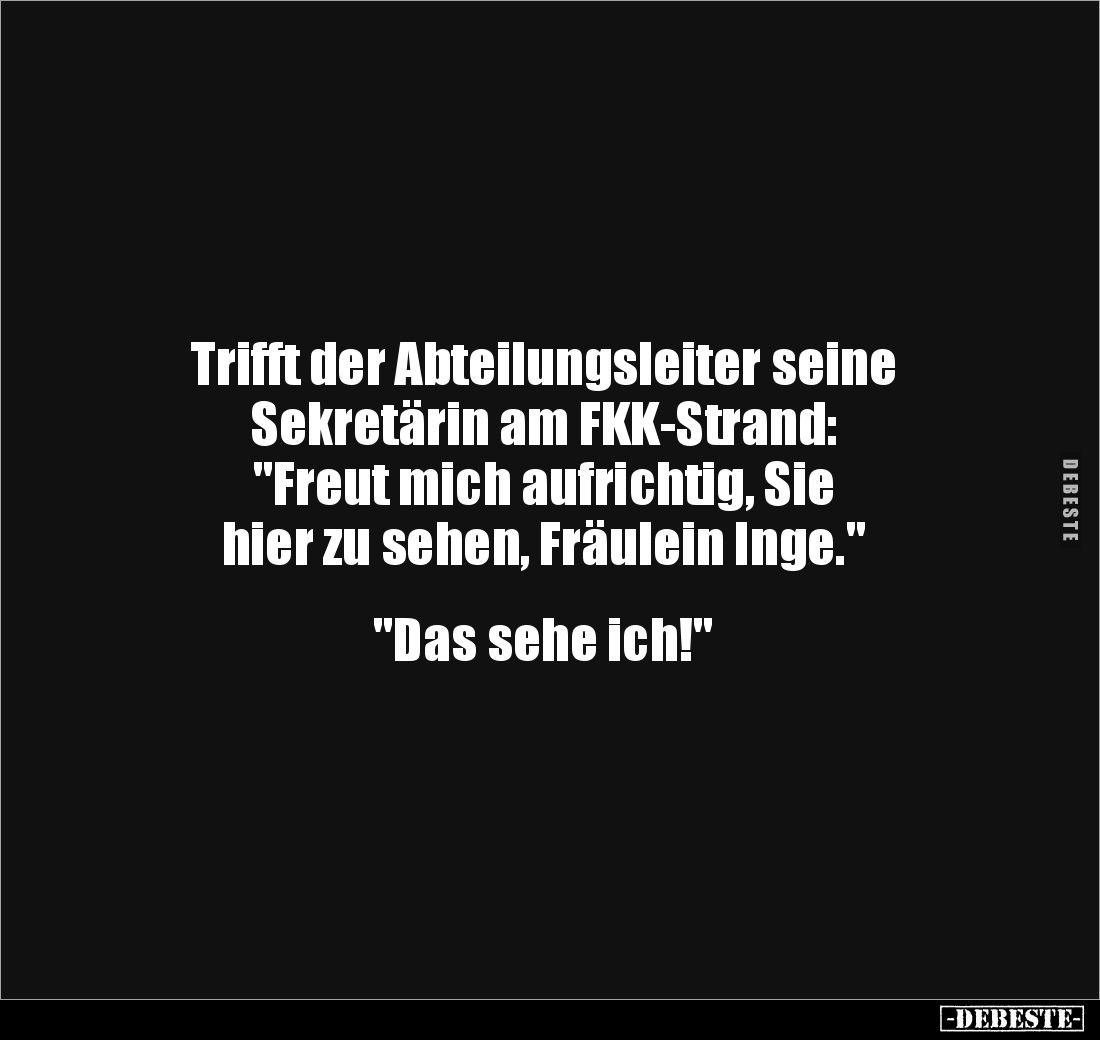 Trifft der Abteilungsleiter seine Sekretärin am FKK-Strand: "Freut mich aufrichtig, Sie hier zu sehen, Fräulein Inge." "Das sehe ich!"