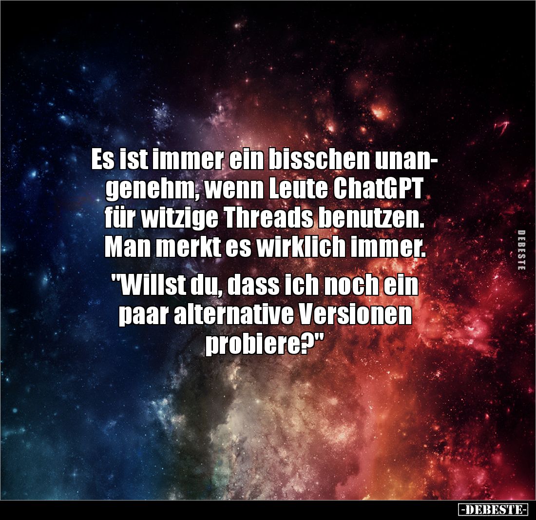 Es ist immer ein bisschen unan- genehm, wenn Leute ChatGPT für witzige Threads benutzen. Man merkt es wirklich immer. "Willst du, dass ich noch ein paar alternative Versionen probiere?"