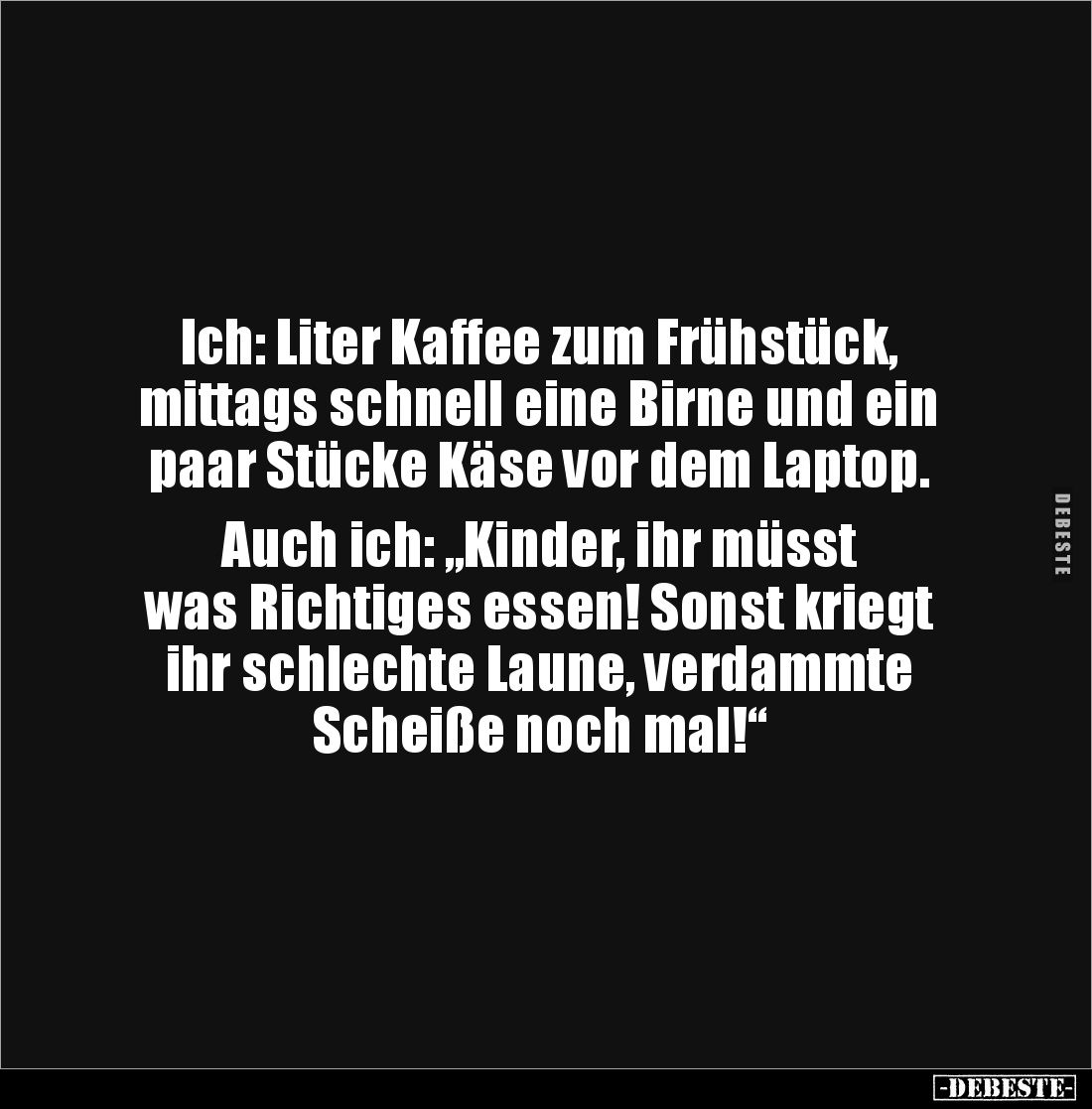 Ich: Liter Kaffee zum Frühstück, mittags schnell eine Birne und ein paar Stücke Käse vor dem Laptop. Auch ich: „Kinder, ihr müsst was Richtiges essen! Sonst kriegt ihr schlechte Laune, verdammte Scheiße noch mal!“