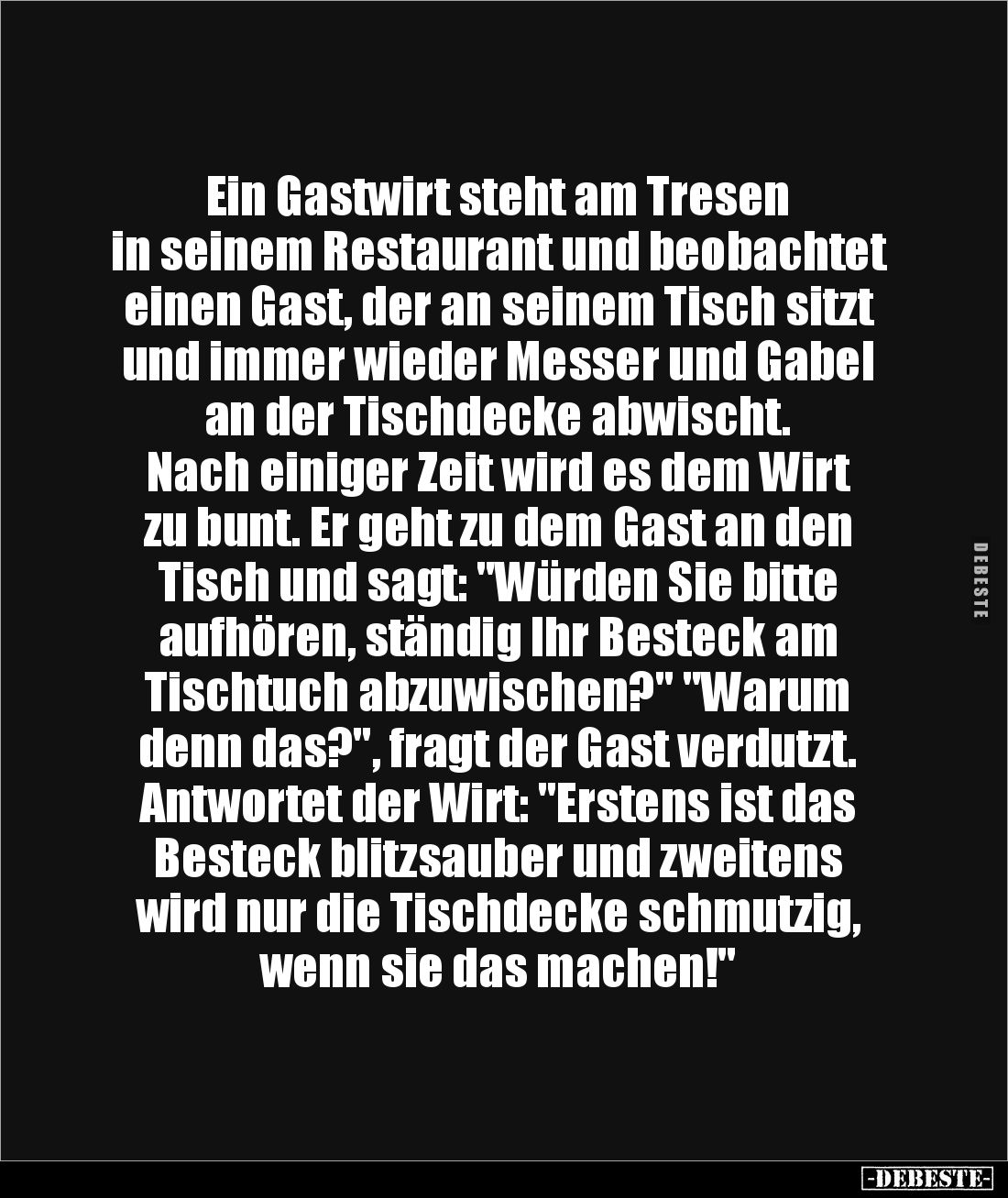 Ein Gastwirt steht am Tresen in seinem Restaurant und beobachtet einen Gast, der an seinem Tisch sitzt und immer wieder Messer und Gabel an der Tischdecke abwischt. Nach einiger Zeit wird es dem Wirt zu bunt. Er geht zu dem Gast an den Tisch und sagt: "Würden Sie bitte aufhören, ständig Ihr Besteck am Tischtuch abzuwischen?" "Warum denn das?", fragt der Gast verdutzt. Antwortet der Wirt: "Erstens ist das Besteck blitzsauber und zweitens wird nur die Tischdecke schmutzig, wenn sie das machen!"