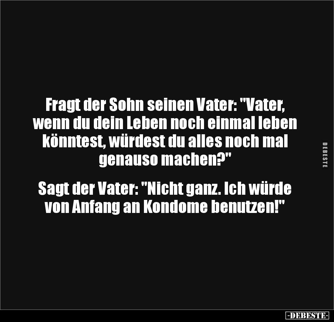 Fragt der Sohn seinen Vater: "Vater, wenn du dein Leben noch einmal leben könntest, würdest du alles noch mal genauso machen?" Sagt der Vater: "Nicht ganz. Ich würde von Anfang an Kondome benutzen!"