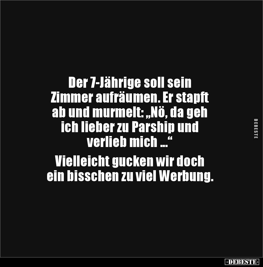 Der 7-Jährige soll sein Zimmer aufräumen. Er stapft ab und murmelt: „Nö, da geh ich lieber zu Parship und verlieb mich ...“ Vielleicht gucken wir doch ein bisschen zu viel Werbung.
