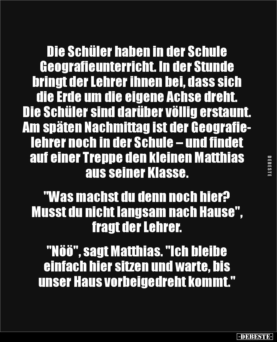 Die Schüler haben in der Schule Geografieunterricht. In der Stunde bringt der Lehrer ihnen bei, dass sich die Erde um die eigene Achse dreht. Die Schüler sind darüber völlig erstaunt. Am späten Nachmittag ist der Geografie- lehrer noch in der Schule – und findet auf einer Treppe den kleinen Matthias aus seiner Klasse. "Was machst du denn noch hier? Musst du nicht langsam nach Hause", fragt der Lehrer. "Nöö", sagt Matthias. "Ich bleibe einfach hier sitzen und warte, bis unser Haus vorbeigedreht kommt."