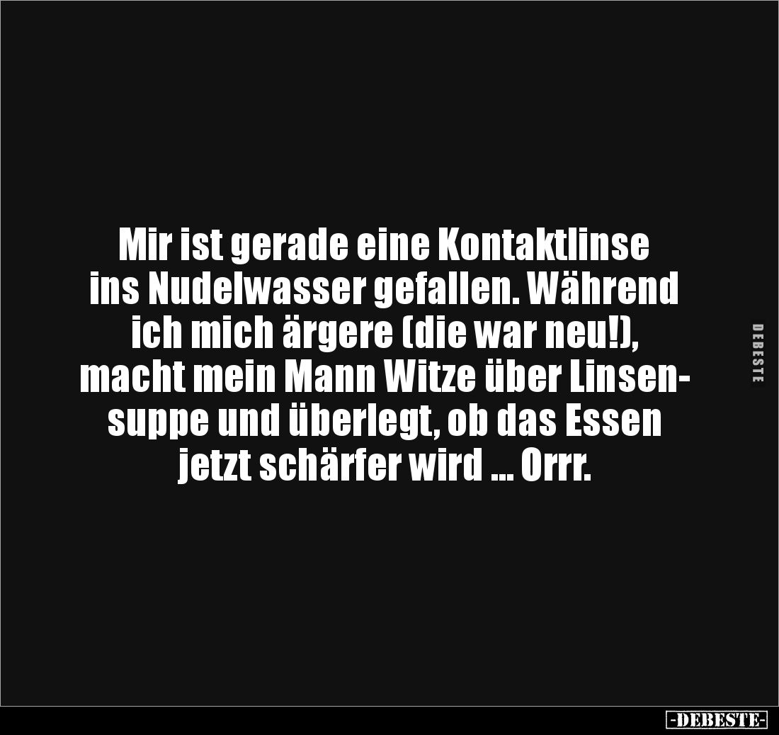 Mir ist gerade eine Kontaktlinse ins Nudelwasser gefallen. Während ich mich ärgere (die war neu!), macht mein Mann Witze über Linsen- suppe und überlegt, ob das Essen jetzt schärfer wird … Orrr.
