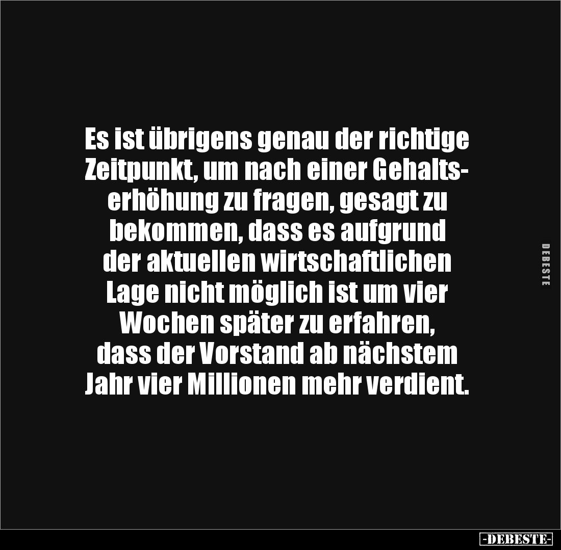 Es ist übrigens genau der richtige Zeitpunkt, um nach einer Gehalts- erhöhung zu fragen, gesagt zu bekommen, dass es aufgrund der aktuellen wirtschaftlichen Lage nicht möglich ist um vier Wochen später zu erfahren, dass der Vorstand ab nächstem Jahr vier Millionen mehr verdient.