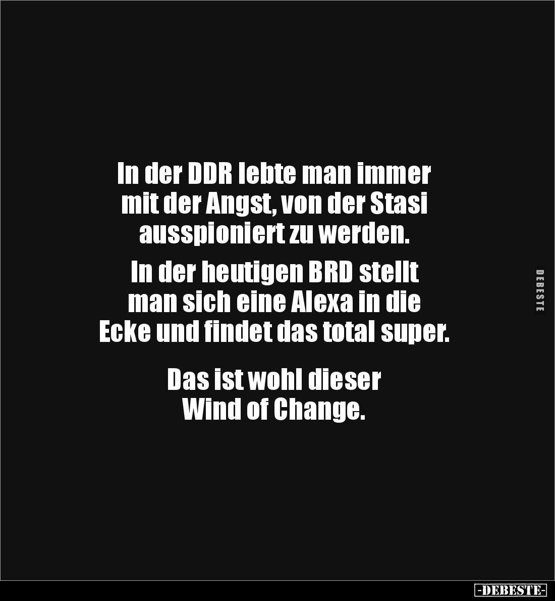 In der DDR lebte man immer mit der Angst, von der Stasi ausspioniert zu werden. In der heutigen BRD stellt man sich eine Alexa in die Ecke und findet das total super. Das ist wohl dieser Wind of Change.
