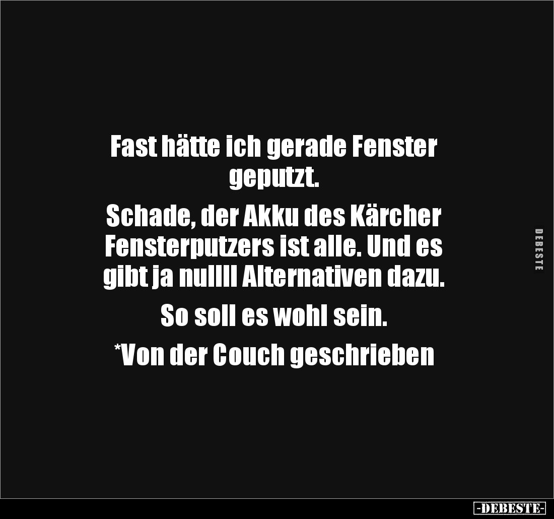 Fast hätte ich gerade Fenster geputzt. Schade, der Akku des Kärcher Fensterputzers ist alle. Und es gibt ja nullll Alternativen dazu. So soll es wohl sein. *Von der Couch geschrieben
