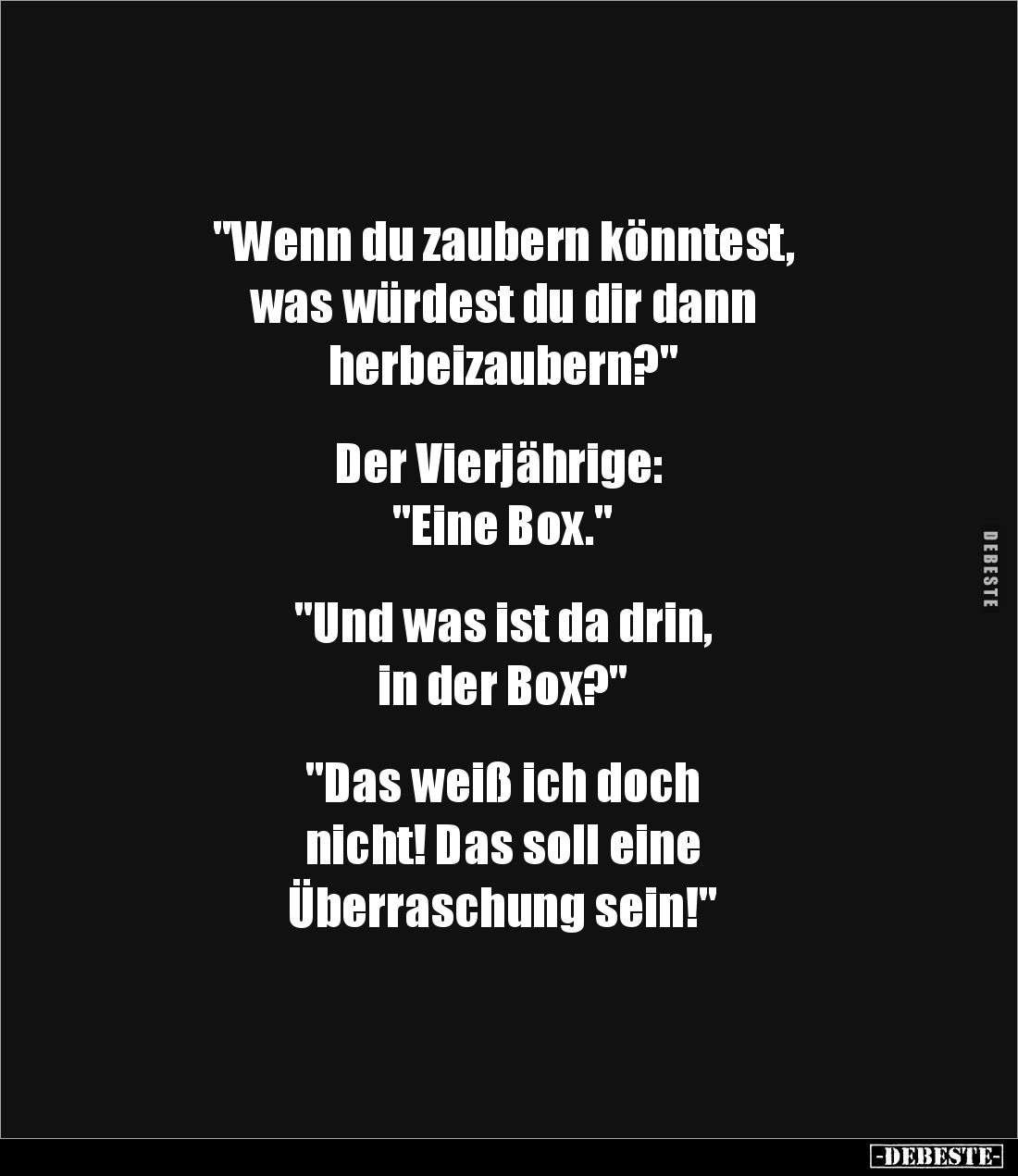 "Wenn du zaubern könntest, was würdest du dir dann herbeizaubern?" Der Vierjährige: "Eine Box." "Und was ist da drin, in der Box?" "Das weiß ich doch nicht! Das soll eine Überraschung sein!"