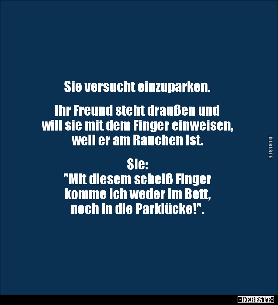 Sie versucht einzuparken. Ihr Freund steht draußen und will sie mit dem Finger einweisen, weil er am Rauchen ist. Sie: "Mit diesem scheiß Finger komme ich weder im Bett, noch in die Parklücke!".