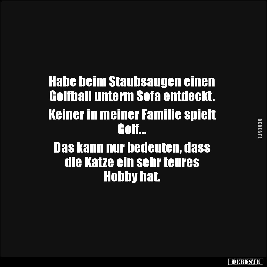 Habe beim Staubsaugen einen Golfball unterm Sofa entdeckt. Keiner in meiner Familie spielt Golf... Das kann nur bedeuten, dass die Katze ein sehr teures Hobby hat.