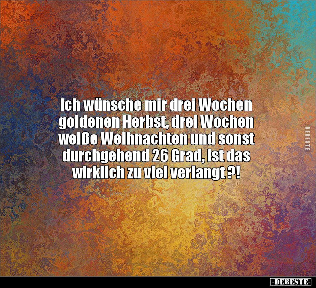 Ich wünsche mir drei Wochen goldenen Herbst, drei Wochen weiße Weihnachten und sonst durchgehend 26 Grad, ist das wirklich zu viel verlangt ?!