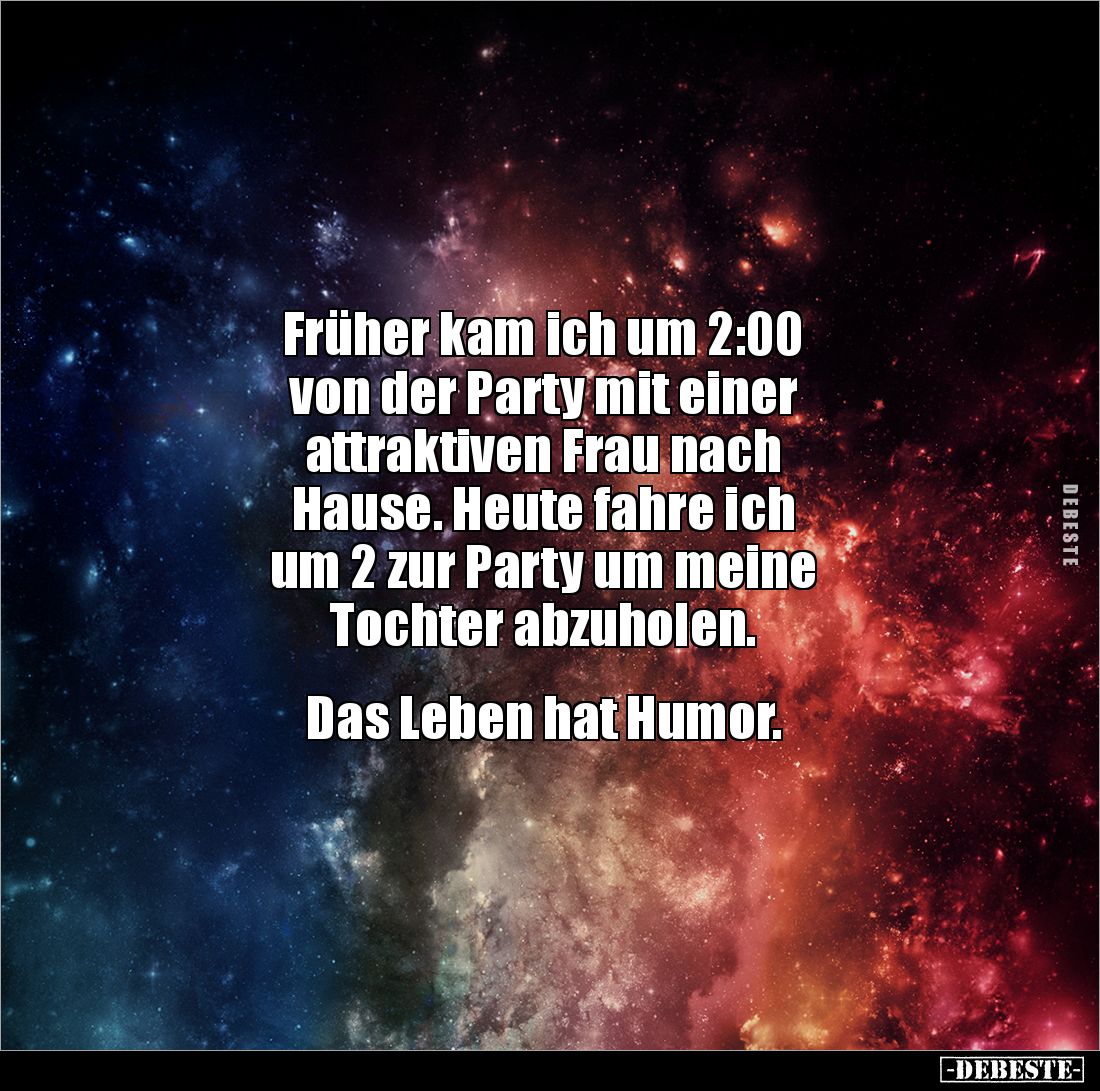 Früher kam ich um 2:00 von der Party mit einer attraktiven Frau nach Hause. Heute fahre ich um 2 zur Party um meine Tochter abzuholen. Das Leben hat Humor.