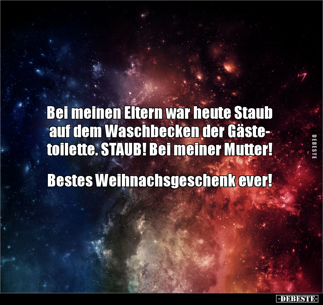 Bei meinen Eltern war heute Staub auf dem Waschbecken der Gäste- toilette. STAUB! Bei meiner Mutter! Bestes Weihnachsgeschenk ever!