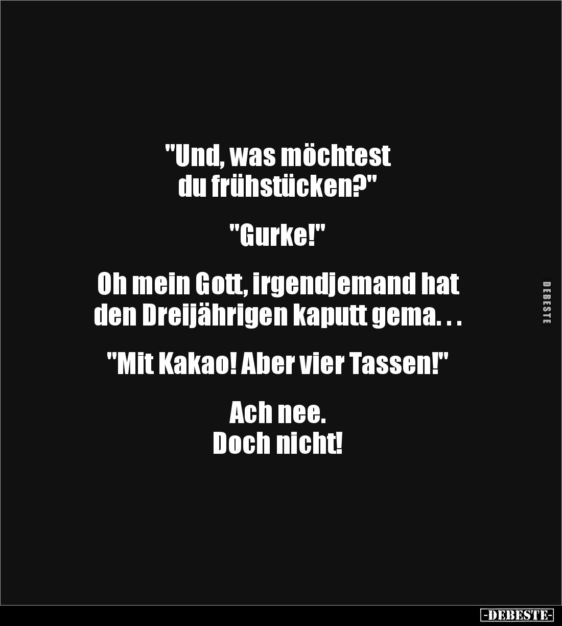 "Und, was möchtest du frühstücken?" "Gurke!" Oh mein Gott, irgendjemand hat den Dreijährigen kaputt gema. . . "Mit Kakao! Aber vier Tassen!" Ach nee. Doch nicht!