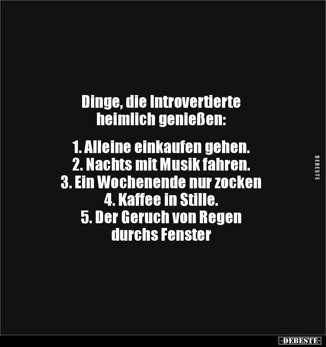 Dinge, die Introvertierte heimlich genießen: 1. Alleine einkaufen gehen. 2. Nachts mit Musik fahren. 3. Ein Wochenende nur zocken 4. Kaffee in Stille. 5. Der Geruch von Regen durchs Fenster