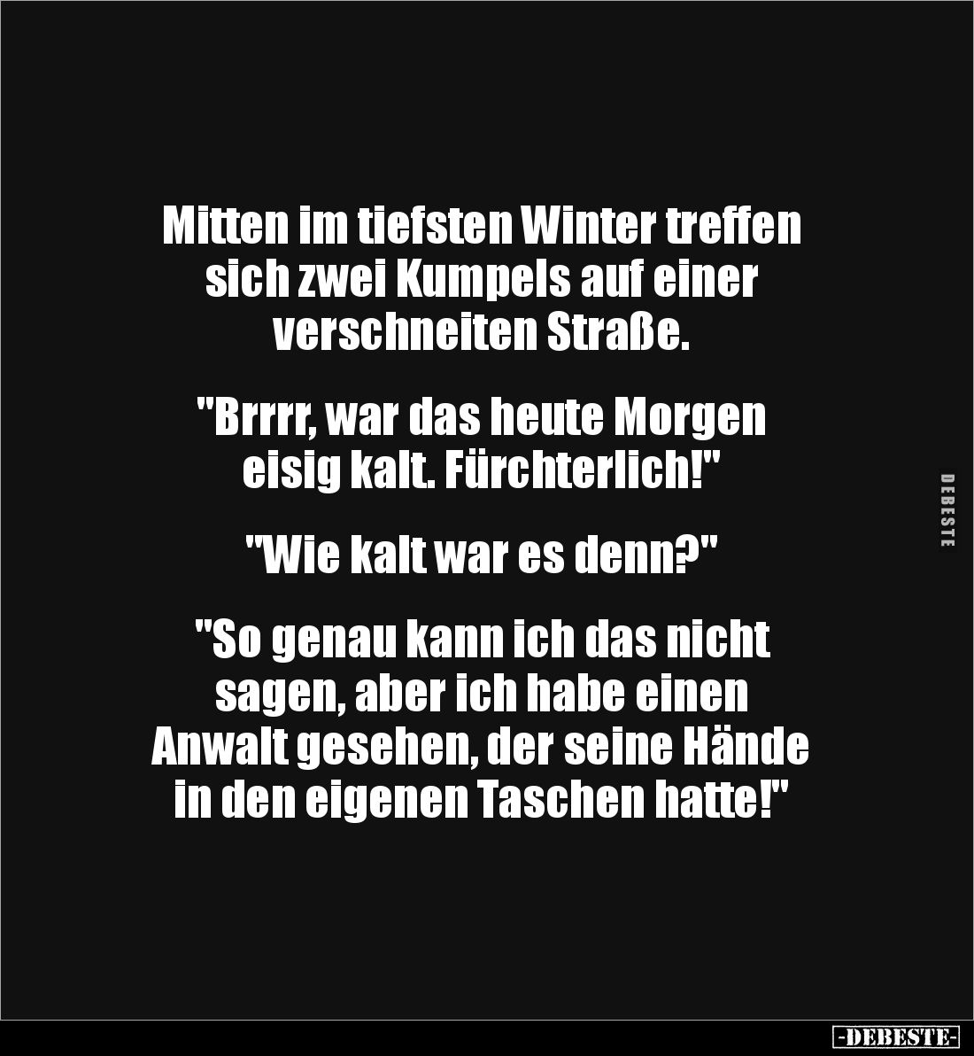 Mitten im tiefsten Winter treffen sich zwei Kumpels auf einer verschneiten Straße. "Brrrr, war das heute Morgen eisig kalt. Fürchterlich!" "Wie kalt war es denn?" "So genau kann ich das nicht sagen, aber ich habe einen Anwalt gesehen, der seine Hände in den eigenen Taschen hatte!"