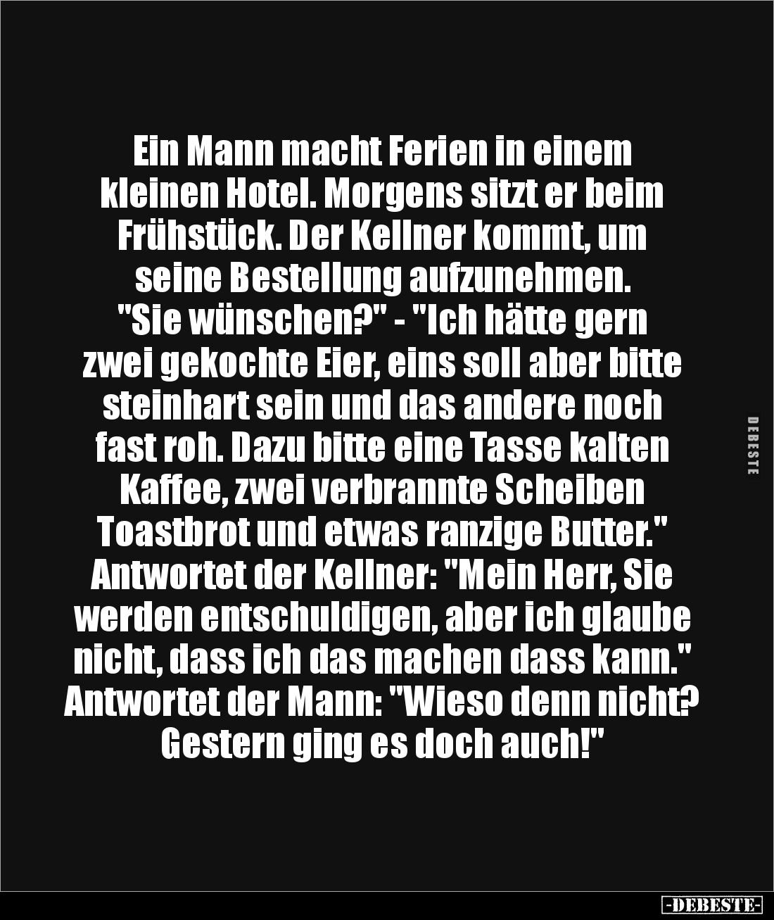 Ein Mann macht Ferien in einem kleinen Hotel. Morgens sitzt er beim Frühstück. Der Kellner kommt, um seine Bestellung aufzunehmen. "Sie wünschen?" - "Ich hätte gern zwei gekochte Eier, eins soll aber bitte steinhart sein und das andere noch fast roh. Dazu bitte eine Tasse kalten Kaffee, zwei verbrannte Scheiben Toastbrot und etwas ranzige Butter." Antwortet der Kellner: "Mein Herr, Sie werden entschuldigen, aber ich glaube nicht, dass ich das machen dass kann." Antwortet der Mann: "Wieso denn nicht? Gestern ging es doch auch!"