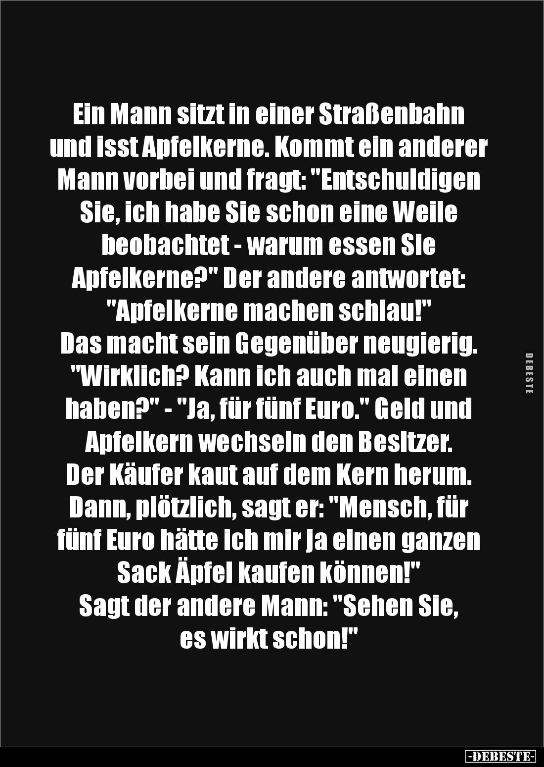 Ein Mann sitzt in einer Straßenbahn und isst Apfelkerne. Kommt ein anderer Mann vorbei und fragt: "Entschuldigen Sie, ich habe Sie schon eine Weile beobachtet - warum essen Sie Apfelkerne?" Der andere antwortet: "Apfelkerne machen schlau!" Das macht sein Gegenüber neugierig. "Wirklich? Kann ich auch mal einen haben?" - "Ja, für fünf Euro." Geld und Apfelkern wechseln den Besitzer. Der Käufer kaut auf dem Kern herum. Dann, plötzlich, sagt er: "Mensch, für fünf Euro hätte ich mir ja einen ganzen Sack Äpfel kaufen können!" Sagt der andere Mann: "Sehen Sie, es wirkt schon!"
