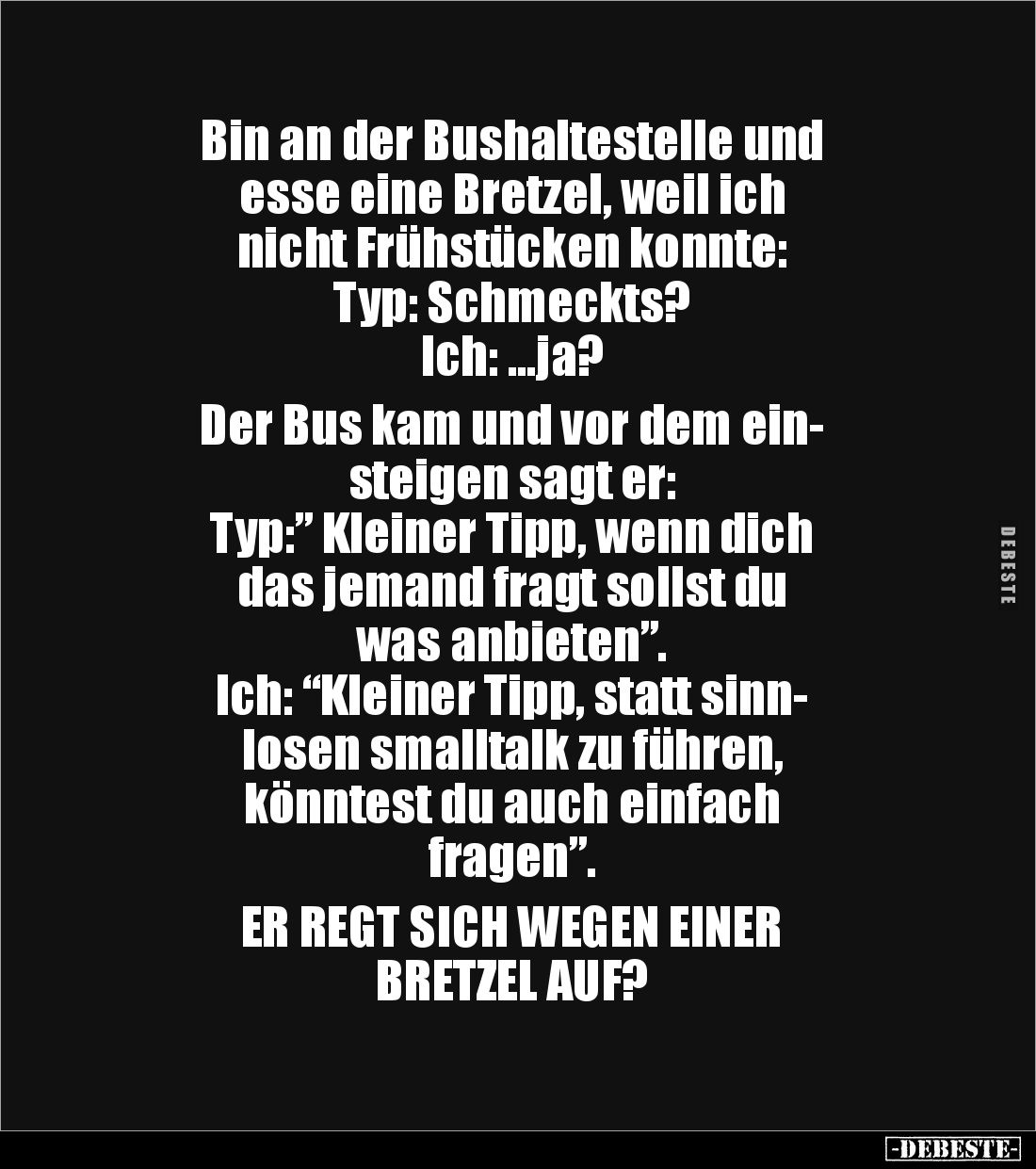 Bin an der Bushaltestelle und esse eine Bretzel, weil ich nicht Frühstücken konnte: Typ: Schmeckts? Ich: …ja? Der Bus kam und vor dem ein- steigen sagt er: Typ:” Kleiner Tipp, wenn dich das jemand fragt sollst du was anbieten”. Ich: “Kleiner Tipp, statt sinn- losen smalltalk zu führen, könntest du auch einfach fragen”. ER REGT SICH WEGEN EINER BRETZEL AUF?