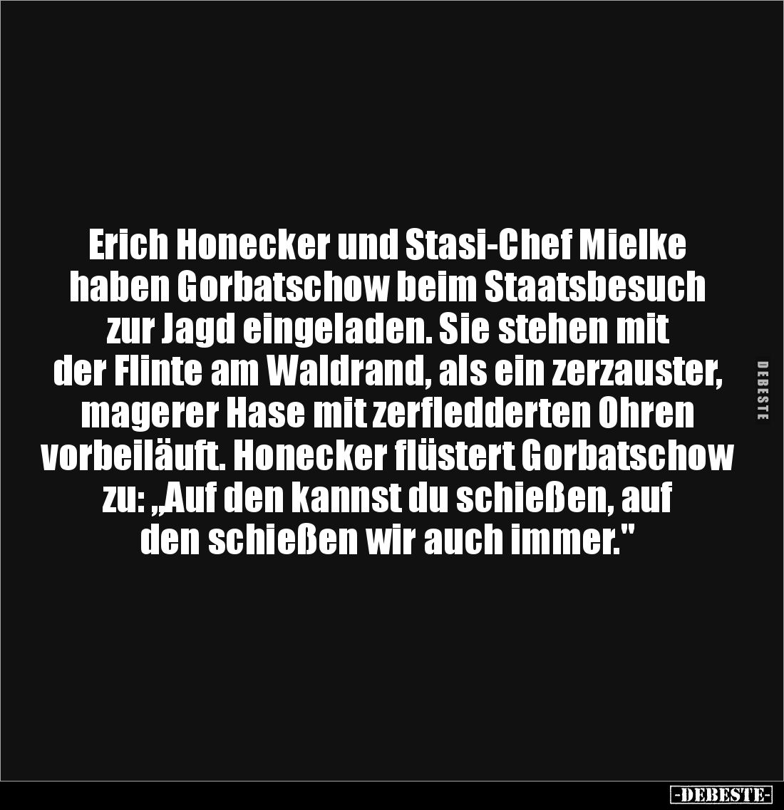 Erich Honecker und Stasi-Chef Mielke haben Gorbatschow beim Staatsbesuch zur Jagd eingeladen. Sie stehen mit der Flinte am Waldrand, als ein zerzauster, magerer Hase mit zerfledderten Ohren vorbeiläuft. Honecker flüstert Gorbatschow zu: „Auf den kannst du schießen, auf den schießen wir auch immer."