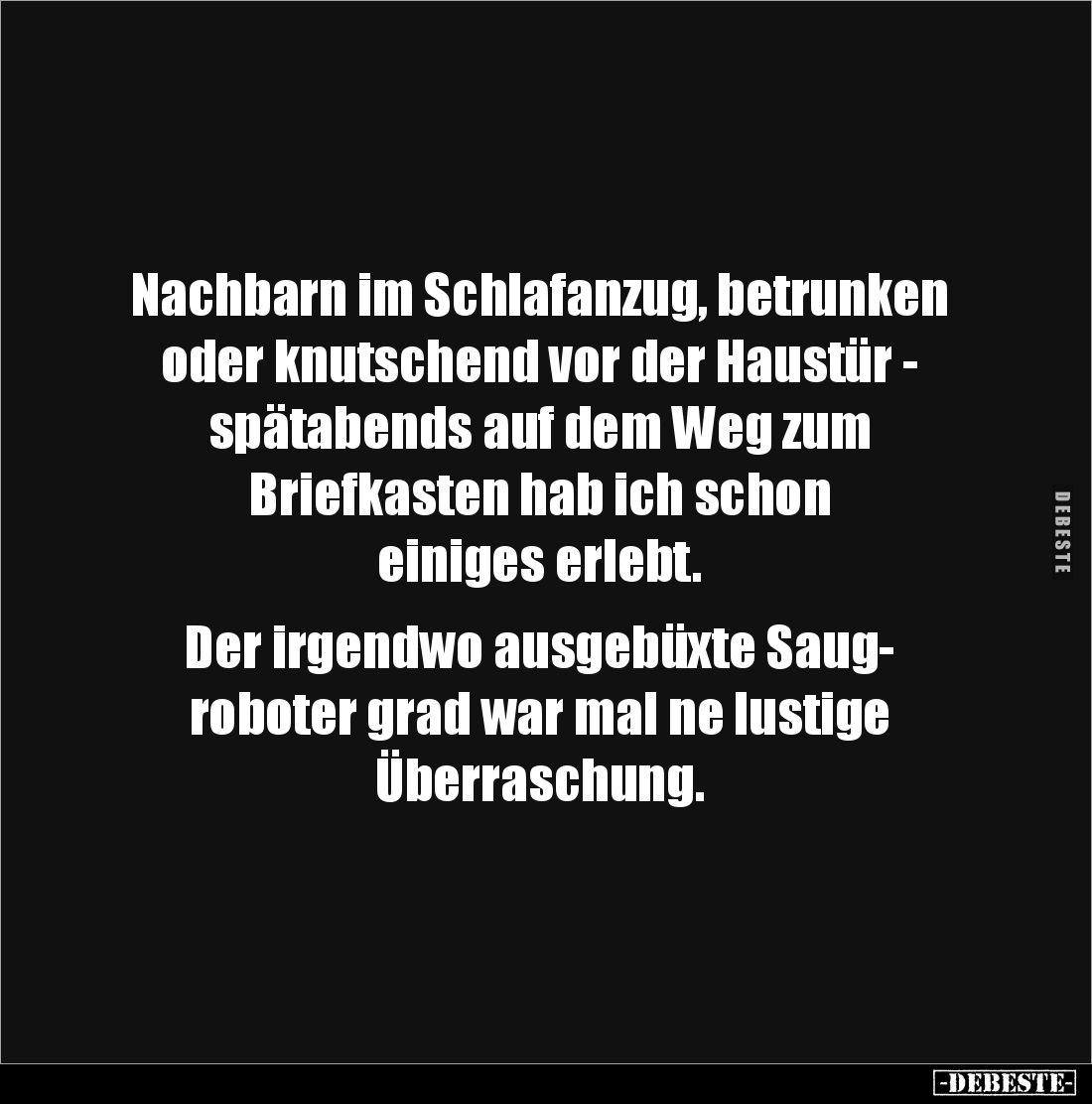 Nachbarn im Schlafanzug, betrunken oder knutschend vor der Haustür - spätabends auf dem Weg zum Briefkasten hab ich schon einiges erlebt. Der irgendwo ausgebüxte Saug- roboter grad war mal ne lustige Überraschung.