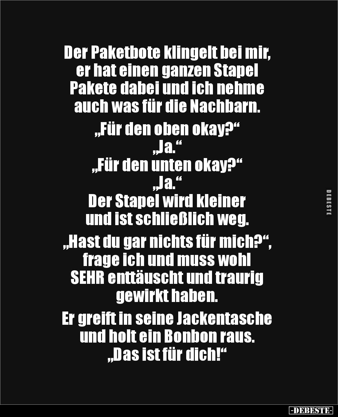 Der Paketbote klingelt bei mir, er hat einen ganzen Stapel Pakete dabei und ich nehme auch was für die Nachbarn. „Für den oben okay?“ „Ja.“ „Für den unten okay?“ „Ja.“ Der Stapel wird kleiner und ist schließlich weg. „Hast du gar nichts für mich?“, frage ich und muss wohl SEHR enttäuscht und traurig gewirkt haben. Er greift in seine Jackentasche und holt ein Bonbon raus. „Das ist für dich!“