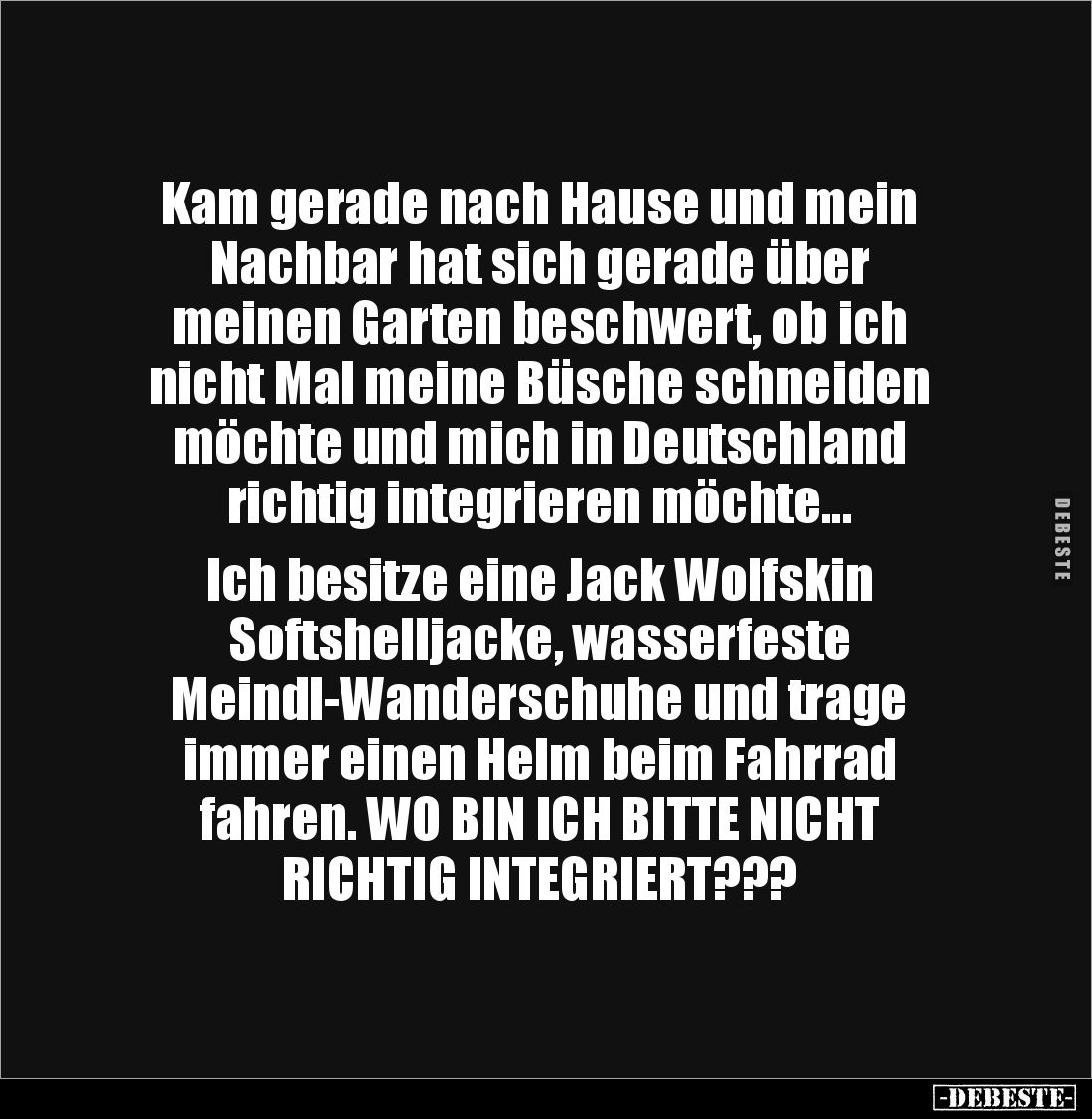 Kam gerade nach Hause und mein Nachbar hat sich gerade über meinen Garten beschwert, ob ich nicht Mal meine Büsche schneiden möchte und mich in Deutschland richtig integrieren möchte... Ich besitze eine Jack Wolfskin Softshelljacke, wasserfeste Meindl-Wanderschuhe und trage immer einen Helm beim Fahrrad fahren. WO BIN ICH BITTE NICHT RICHTIG INTEGRIERT???