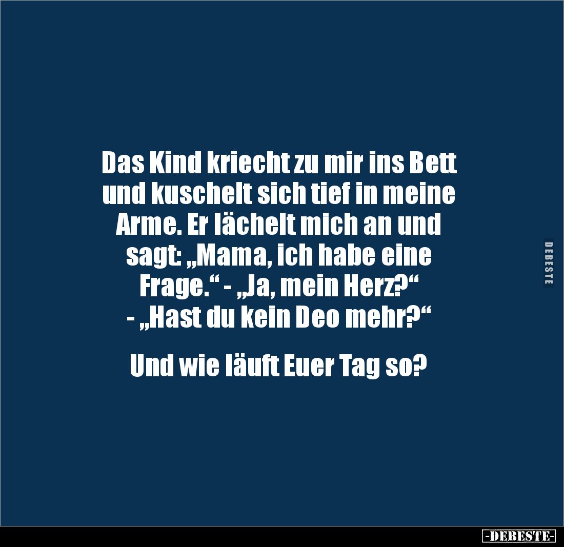 Das Kind kriecht zu mir ins Bett und kuschelt sich tief in meine Arme. Er lächelt mich an und sagt: „Mama, ich habe eine Frage.“ - „Ja, mein Herz?“ - „Hast du kein Deo mehr?“ Und wie läuft Euer Tag so?