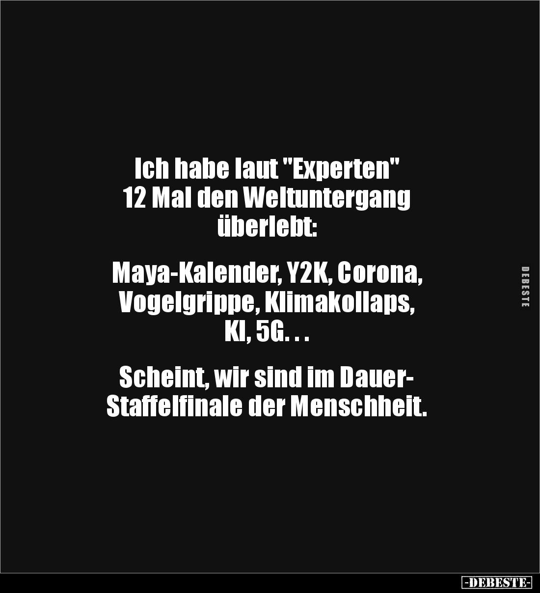 Ich habe laut "Experten" 12 Mal den Weltuntergang überlebt: Maya-Kalender, Y2K, Corona, Vogelgrippe, Klimakollaps, KI, 5G. . . Scheint, wir sind im Dauer- Staffelfinale der Menschheit.