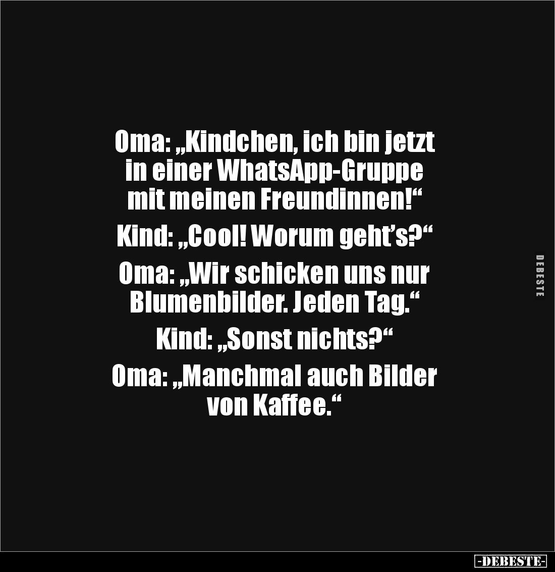 Oma: „Kindchen, ich bin jetzt in einer WhatsApp-Gruppe mit meinen Freundinnen!“ Kind: „Cool! Worum geht’s?“ Oma: „Wir schicken uns nur Blumenbilder. Jeden Tag.“ Kind: „Sonst nichts?“ Oma: „Manchmal auch Bilder von Kaffee.“