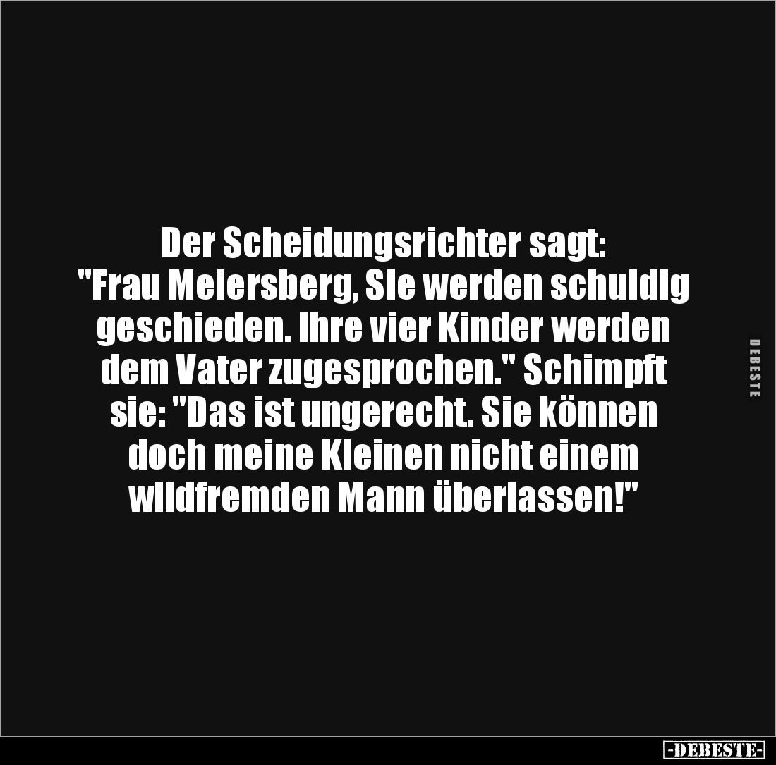 Der Scheidungsrichter sagt: "Frau Meiersberg, Sie werden schuldig geschieden. Ihre vier Kinder werden dem Vater zugesprochen." Schimpft sie: "Das ist ungerecht. Sie können doch meine Kleinen nicht einem wildfremden Mann überlassen!"