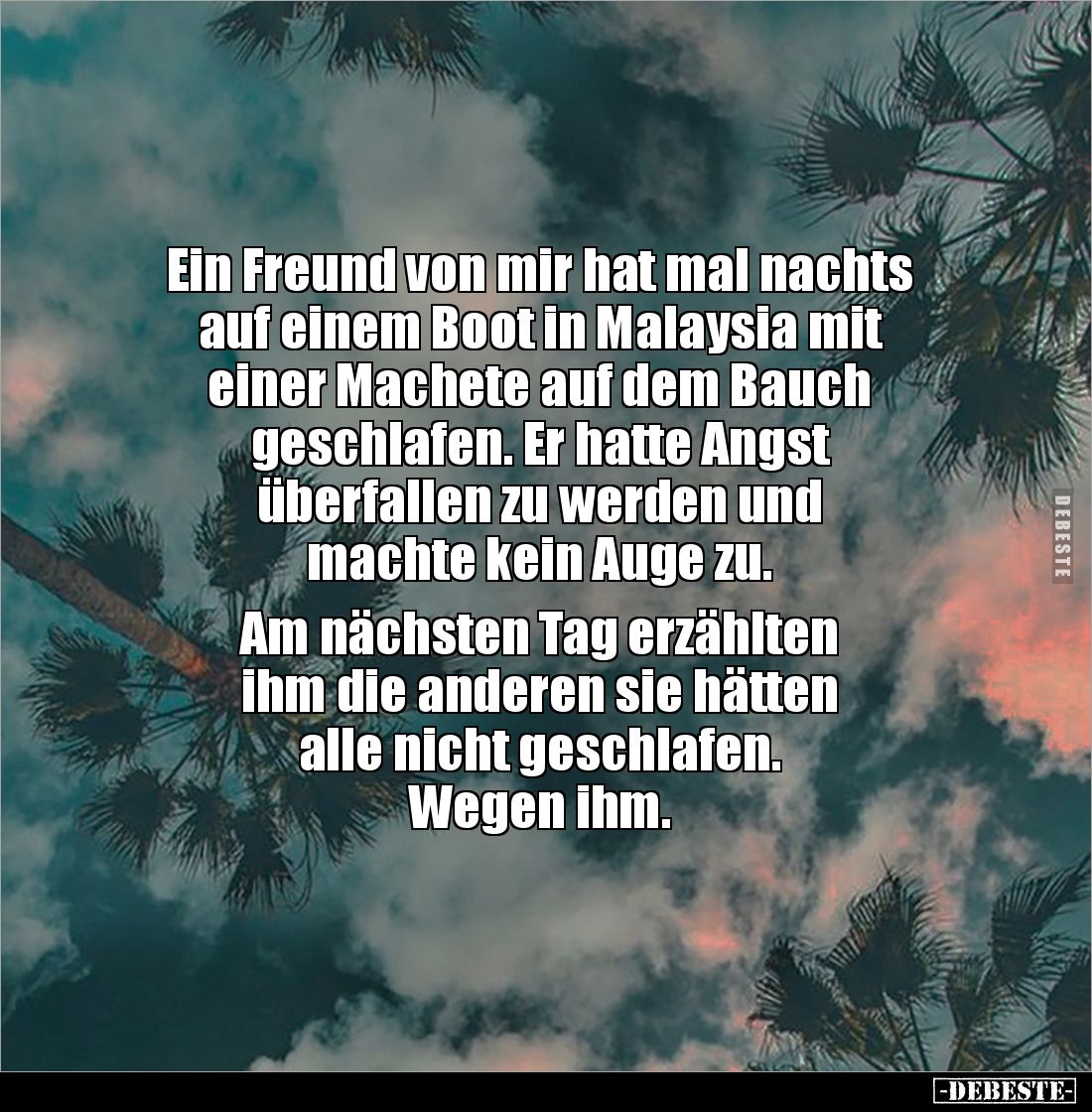 Ein Freund von mir hat mal nachts auf einem Boot in Malaysia mit einer Machete auf dem Bauch geschlafen. Er hatte Angst überfallen zu werden und machte kein Auge zu. Am nächsten Tag erzählten ihm die anderen sie hätten alle nicht geschlafen. Wegen ihm.