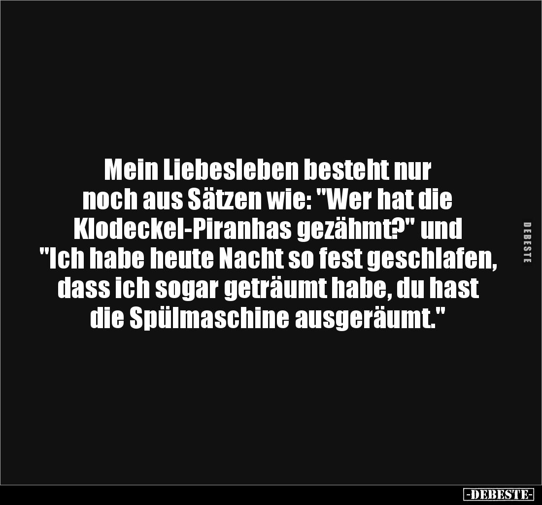 Mein Liebesleben besteht nur noch aus Sätzen wie: "Wer hat die Klodeckel-Piranhas gezähmt?" und "Ich habe heute Nacht so fest geschlafen, dass ich sogar geträumt habe, du hast die Spülmaschine ausgeräumt."