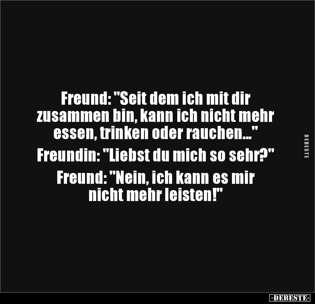Freund: "Seit dem ich mit dir zusammen bin, kann ich nicht mehr essen, trinken oder rauchen..." Freundin: "Liebst du mich so sehr?" Freund: "Nein, ich kann es mir nicht mehr leisten!"