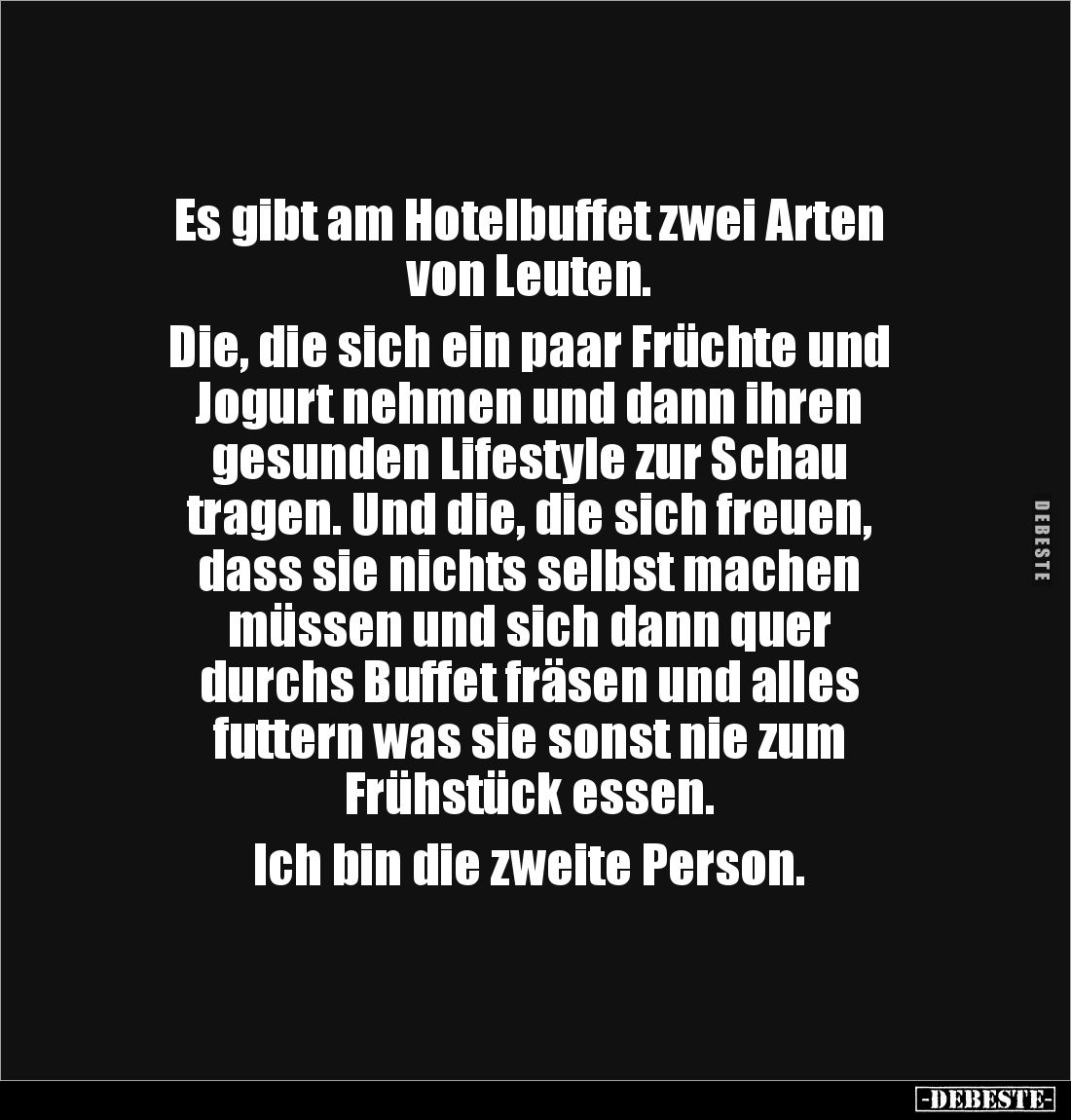 Es gibt am Hotelbuffet zwei Arten von Leuten. Die, die sich ein paar Früchte und Jogurt nehmen und dann ihren gesunden Lifestyle zur Schau tragen. Und die, die sich freuen, dass sie nichts selbst machen müssen und sich dann quer durchs Buffet fräsen und alles futtern was sie sonst nie zum Frühstück essen. Ich bin die zweite Person.