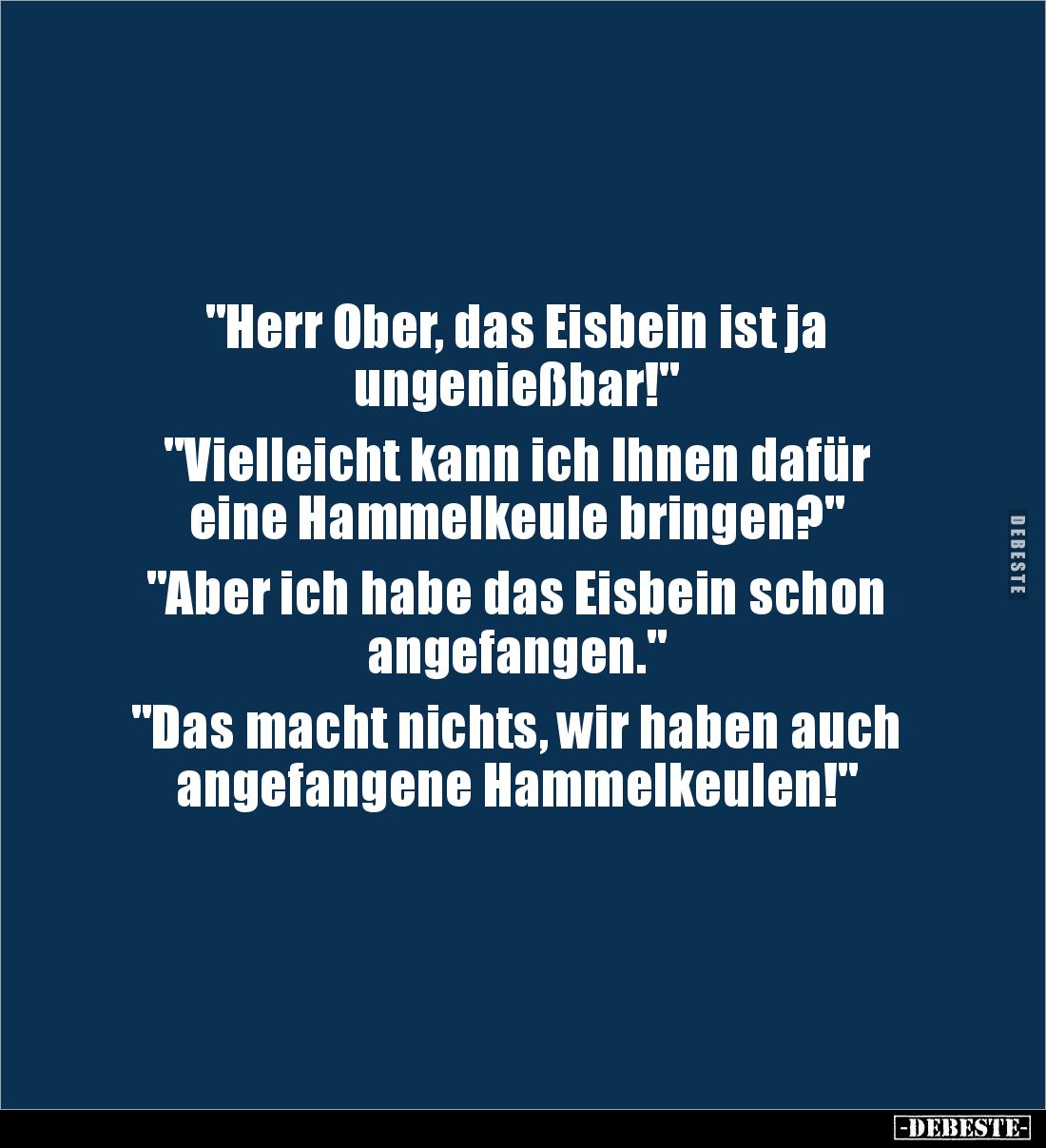 "Herr Ober, das Eisbein ist ja ungenießbar!" "Vielleicht kann ich Ihnen dafür eine Hammelkeule bringen?" "Aber ich habe das Eisbein schon angefangen." "Das macht nichts, wir haben auch angefangene Hammelkeulen!"