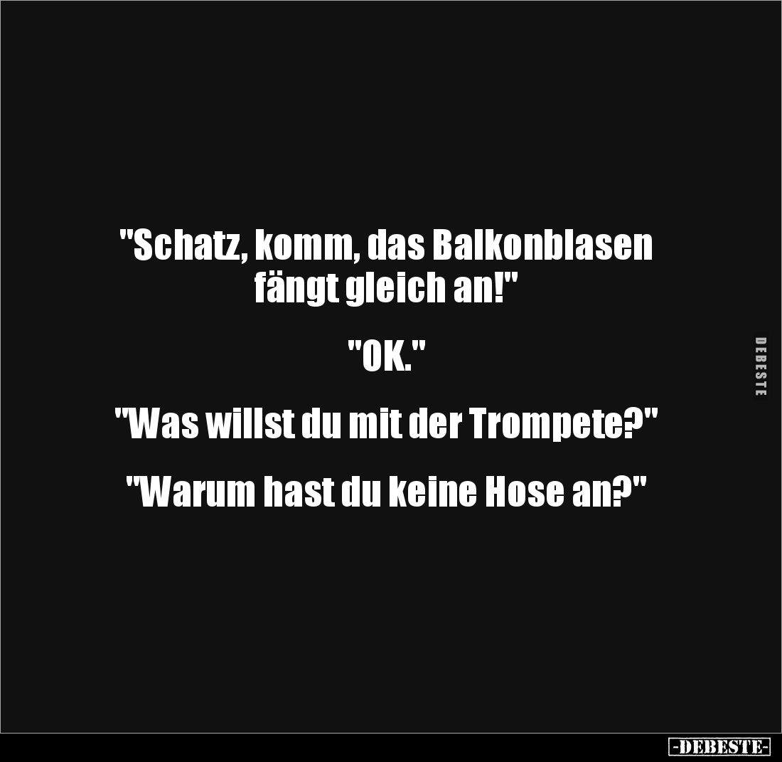 "Schatz, komm, das Balkonblasen fängt gleich an!" "ΟΚ." "Was willst du mit der Trompete?" "Warum hast du keine Hose an?"
