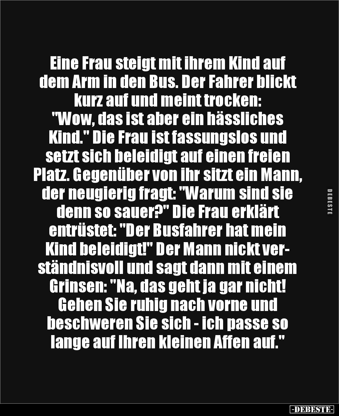 Eine Frau steigt mit ihrem Kind auf dem Arm in den Bus. Der Fahrer blickt kurz auf und meint trocken: "Wow, das ist aber ein hässliches Kind." Die Frau ist fassungslos und setzt sich beleidigt auf einen freien Platz. Gegenüber von ihr sitzt ein Mann, der neugierig fragt: "Warum sind sie denn so sauer?" Die Frau erklärt entrüstet: "Der Busfahrer hat mein Kind beleidigt!" Der Mann nickt ver- ständnisvoll und sagt dann mit einem Grinsen: "Na, das geht ja gar nicht! Gehen Sie ruhig nach vorne und beschweren Sie sich - ich passe so lange auf Ihren kleinen Affen auf."