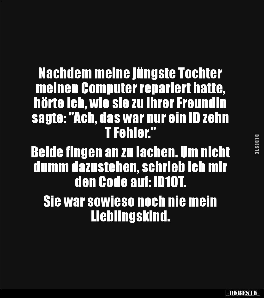 Nachdem meine jüngste Tochter meinen Computer repariert hatte, hörte ich, wie sie zu ihrer Freundin sagte: "Ach, das war nur ein ID zehn T Fehler." Beide fingen an zu lachen. Um nicht dumm dazustehen, schrieb ich mir den Code auf: ID1OT. Sie war sowieso noch nie mein Lieblingskind.
