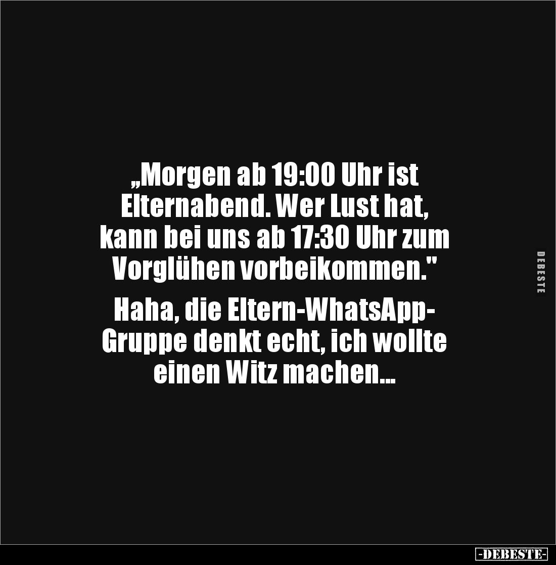 ,,Morgen ab 19:00 Uhr ist Elternabend. Wer Lust hat, kann bei uns ab 17:30 Uhr zum Vorglühen vorbeikommen." Haha, die Eltern-WhatsApp- Gruppe denkt echt, ich wollte einen Witz machen...