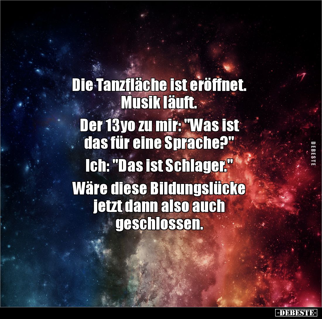 Die Tanzfläche ist eröffnet. Musik läuft. Der 13yo zu mir: "Was ist das für eine Sprache?" Ich: "Das ist Schlager." Wäre diese Bildungslücke jetzt dann also auch geschlossen.