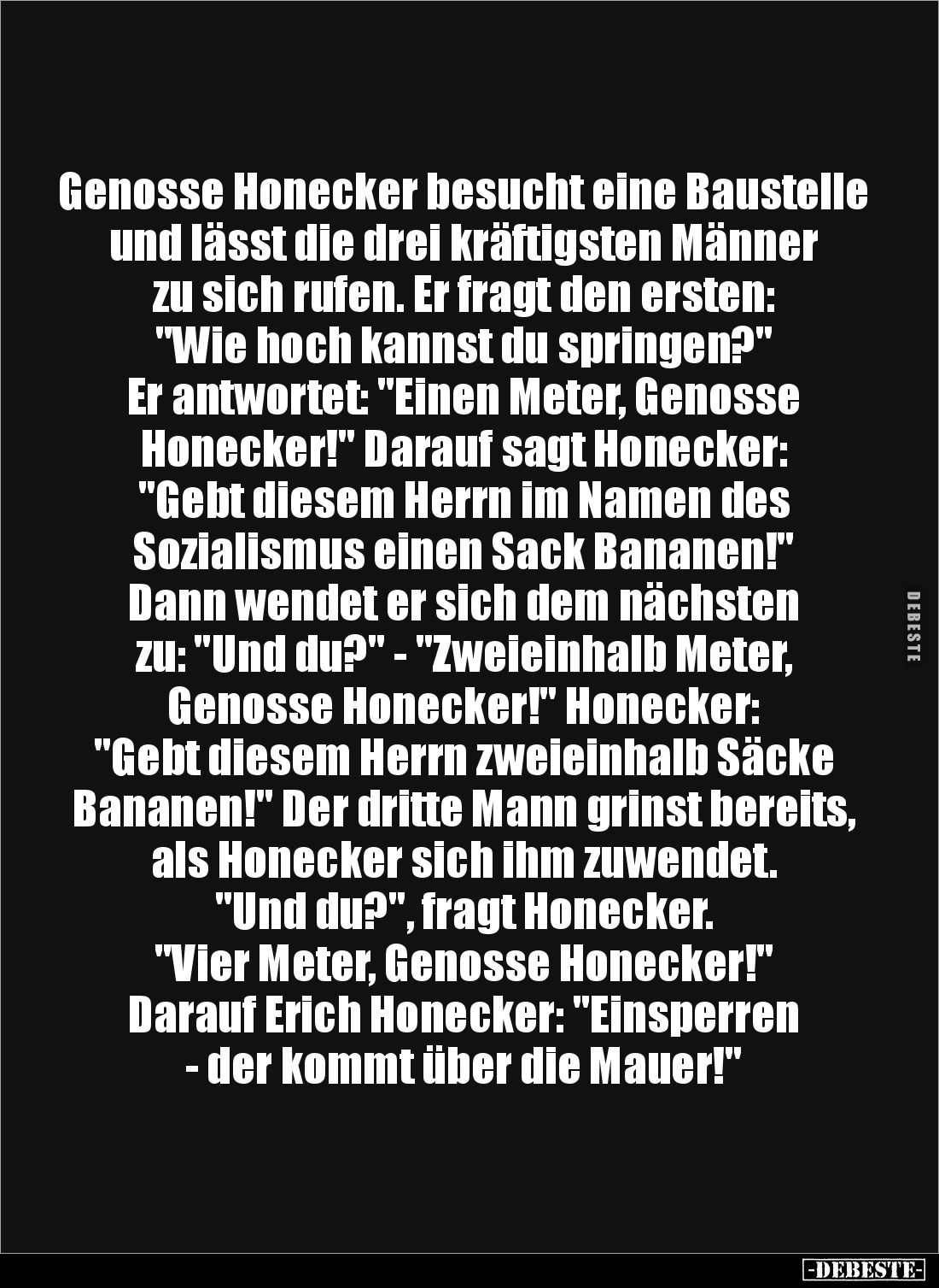 Genosse Honecker besucht eine Baustelle und lässt die drei kräftigsten Männer zu sich rufen. Er fragt den ersten: "Wie hoch kannst du springen?" Er antwortet: "Einen Meter, Genosse Honecker!" Darauf sagt Honecker: "Gebt diesem Herrn im Namen des Sozialismus einen Sack Bananen!" Dann wendet er sich dem nächsten zu: "Und du?" - "Zweieinhalb Meter, Genosse Honecker!" Honecker: "Gebt diesem Herrn zweieinhalb Säcke Bananen!" Der dritte Mann grinst bereits, als Honecker sich ihm zuwendet. "Und du?", fragt Honecker. "Vier Meter, Genosse Honecker!" Darauf Erich Honecker: "Einsperren - der kommt über die Mauer!"