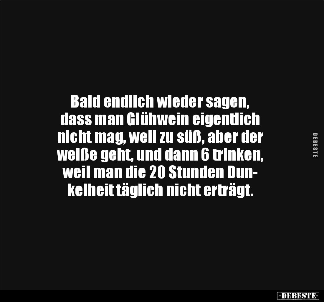 Bald endlich wieder sagen, dass man Glühwein eigentlich nicht mag, weil zu süß, aber der weiße geht, und dann 6 trinken, weil man die 20 Stunden Dun- kelheit täglich nicht erträgt.