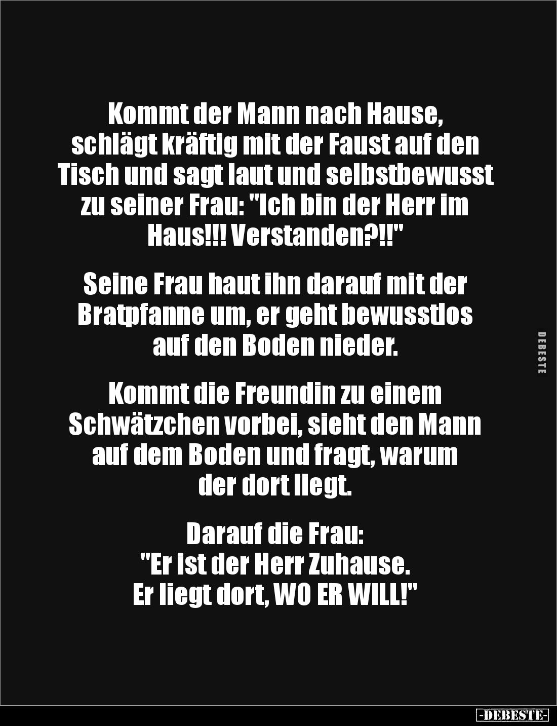 Kommt der Mann nach Hause, schlägt kräftig mit der Faust auf den Tisch und sagt laut und selbstbewusst zu seiner Frau: "Ich bin der Herr im Haus!!! Verstanden?!!" Seine Frau haut ihn darauf mit der Bratpfanne um, er geht bewusstlos auf den Boden nieder. Kommt die Freundin zu einem Schwätzchen vorbei, sieht den Mann auf dem Boden und fragt, warum der dort liegt. Darauf die Frau: "Er ist der Herr Zuhause. Er liegt dort, WO ER WILL!"