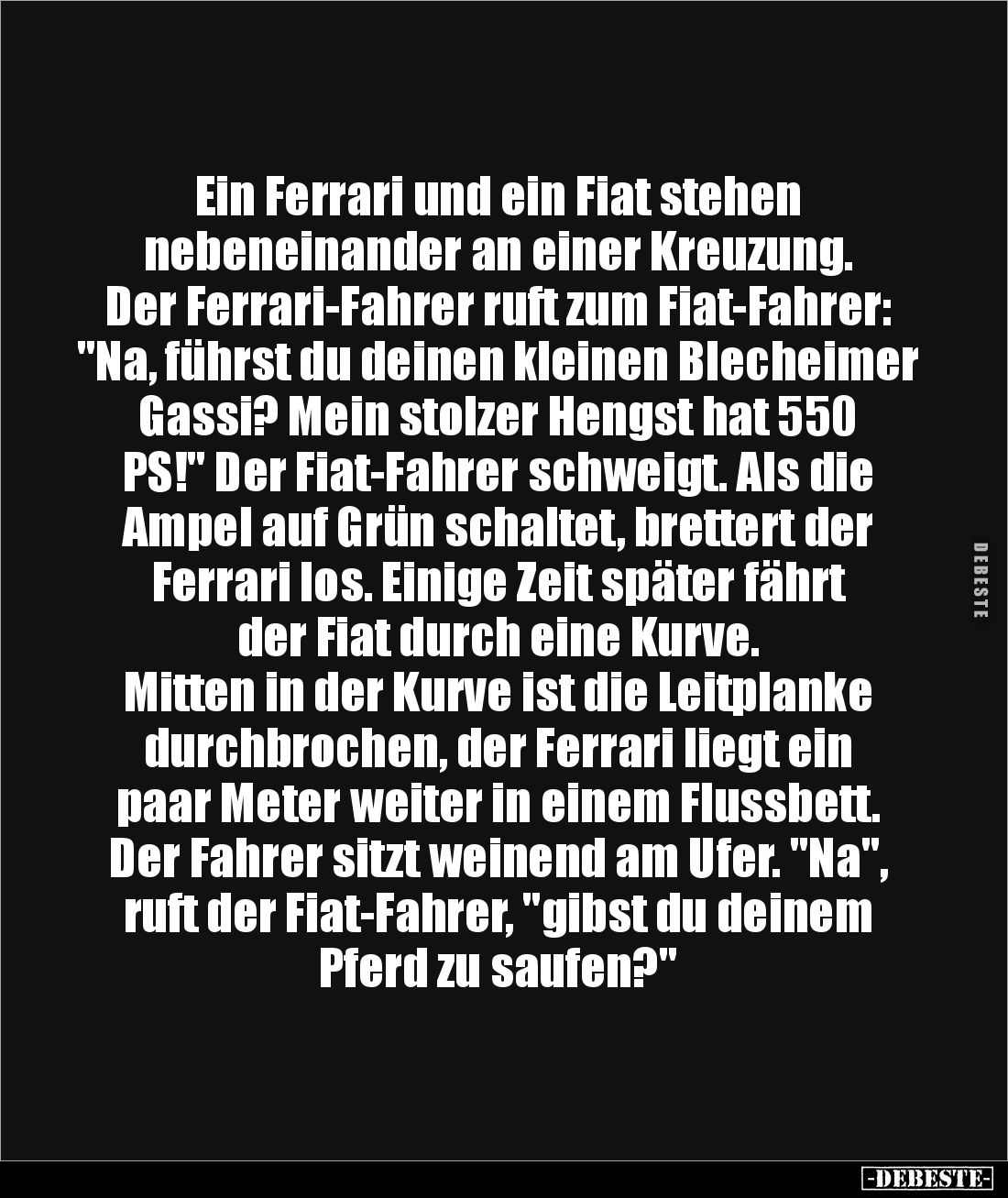 Ein Ferrari und ein Fiat stehen nebeneinander an einer Kreuzung. Der Ferrari-Fahrer ruft zum Fiat-Fahrer: "Na, führst du deinen kleinen Blecheimer Gassi? Mein stolzer Hengst hat 550 PS!" Der Fiat-Fahrer schweigt. Als die Ampel auf Grün schaltet, brettert der Ferrari los. Einige Zeit später fährt der Fiat durch eine Kurve. Mitten in der Kurve ist die Leitplanke durchbrochen, der Ferrari liegt ein paar Meter weiter in einem Flussbett. Der Fahrer sitzt weinend am Ufer. "Na", ruft der Fiat-Fahrer, "gibst du deinem Pferd zu saufen?"