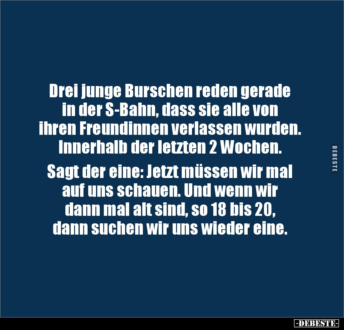 Drei junge Burschen reden gerade in der S-Bahn, dass sie alle von ihren Freundinnen verlassen wurden. Innerhalb der letzten 2 Wochen. Sagt der eine: Jetzt müssen wir mal auf uns schauen. Und wenn wir dann mal alt sind, so 18 bis 20, dann suchen wir uns wieder eine.