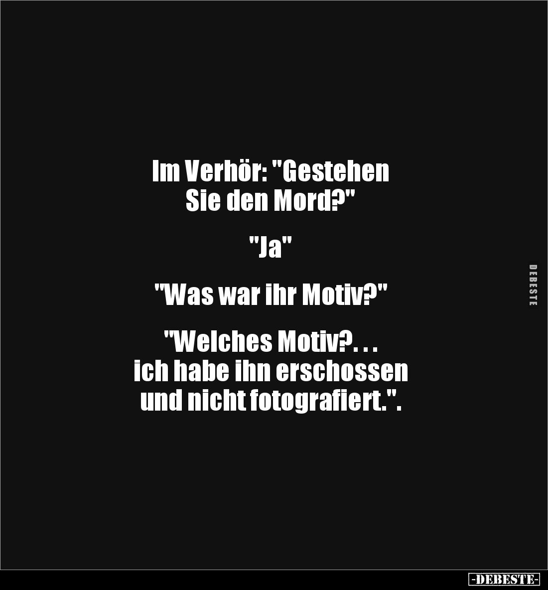 lm Verhör: "Gestehen Sie den Mord?" "Ja" "Was war ihr Motiv?" "Welches Motiv?. . . ich habe ihn erschossen und nicht fotografiert.".