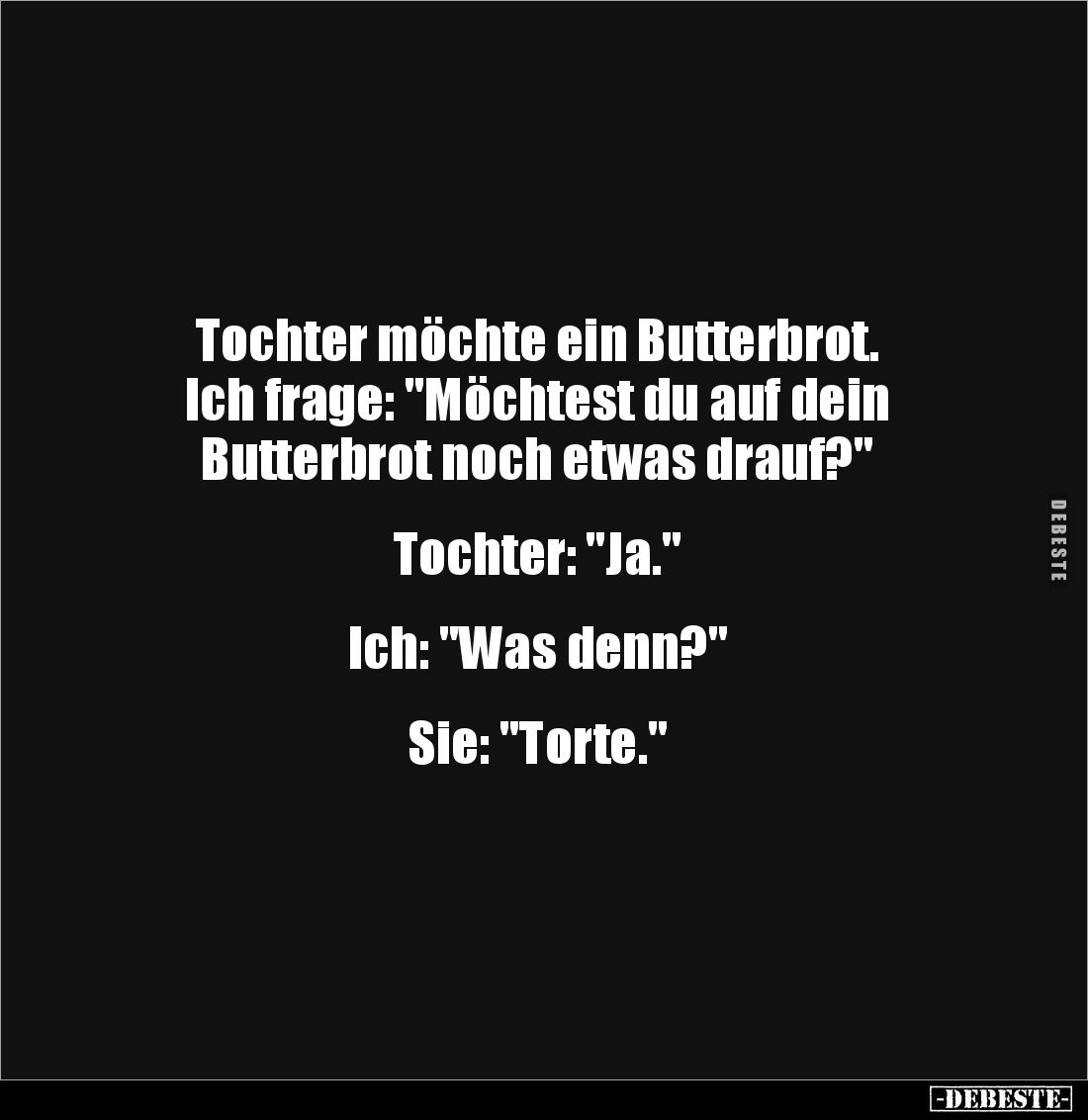 Tochter möchte ein Butterbrot. Ich frage: "Möchtest du auf dein Butterbrot noch etwas drauf?" Tochter: "Ja." Ich: "Was denn?" Sie: "Torte."