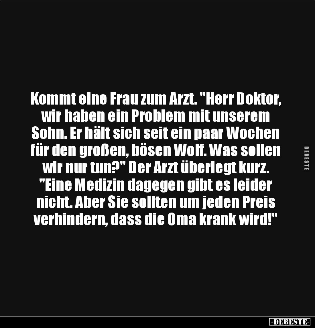 Kommt eine Frau zum Arzt. "Herr Doktor, wir haben ein Problem mit unserem Sohn. Er hält sich seit ein paar Wochen für den großen, bösen Wolf. Was sollen wir nur tun?" Der Arzt überlegt kurz. "Eine Medizin dagegen gibt es leider nicht. Aber Sie sollten um jeden Preis verhindern, dass die Oma krank wird!"