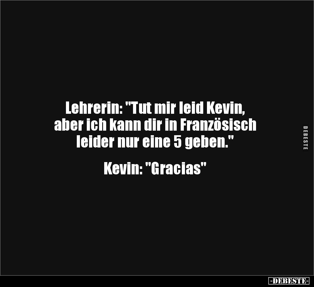 Lehrerin: "Tut mir leid Kevin, aber ich kann dir in Französisch leider nur eine 5 geben." Kevin: "Gracias"